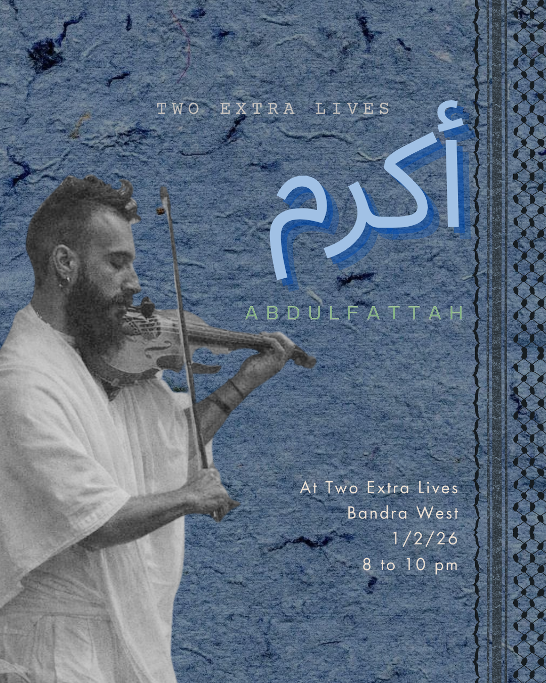 Two Extra Lives invites Akram Abdulfattah, a Palestinian-American violinist, composer, and producer. Influenced by Arabic classical masters and shaped by collaborations with artists such as Simon Shaheen, Omar Faruk Tekbilek, and Bassam Saba, His music fuses Palestinian, Arab, and Indian traditions.